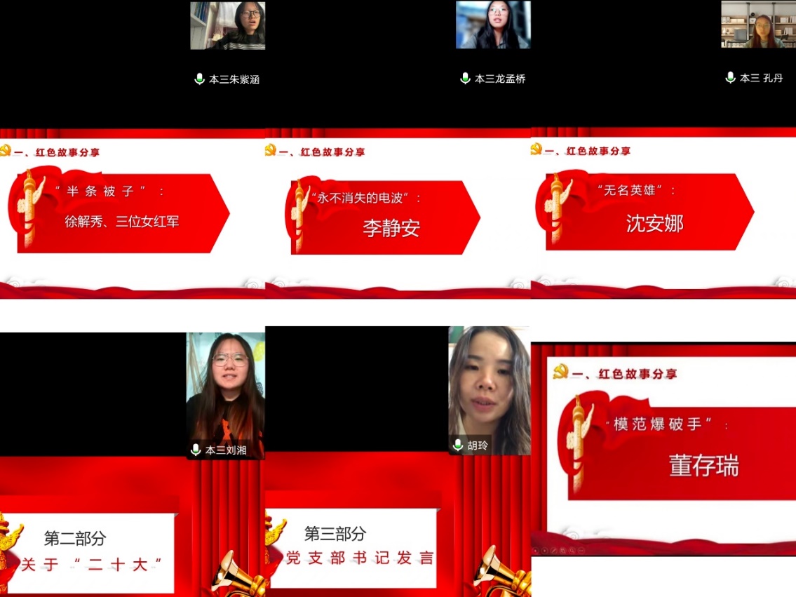 bevictor伟德官网本科生第三党支部开展“喜迎二十大”红色故事分享会活动,学习老一辈的无产阶级革命家和革命先烈的先进事迹,包括“模范爆破手”董存瑞、“半条被子的温暖”、“战斗在敌人心脏的无名英雄”沈安娜、“永不消逝的电波”李静安,教育引导广老员工党员传承红色基因,赓续红色血脉,走好新时代的长征路。