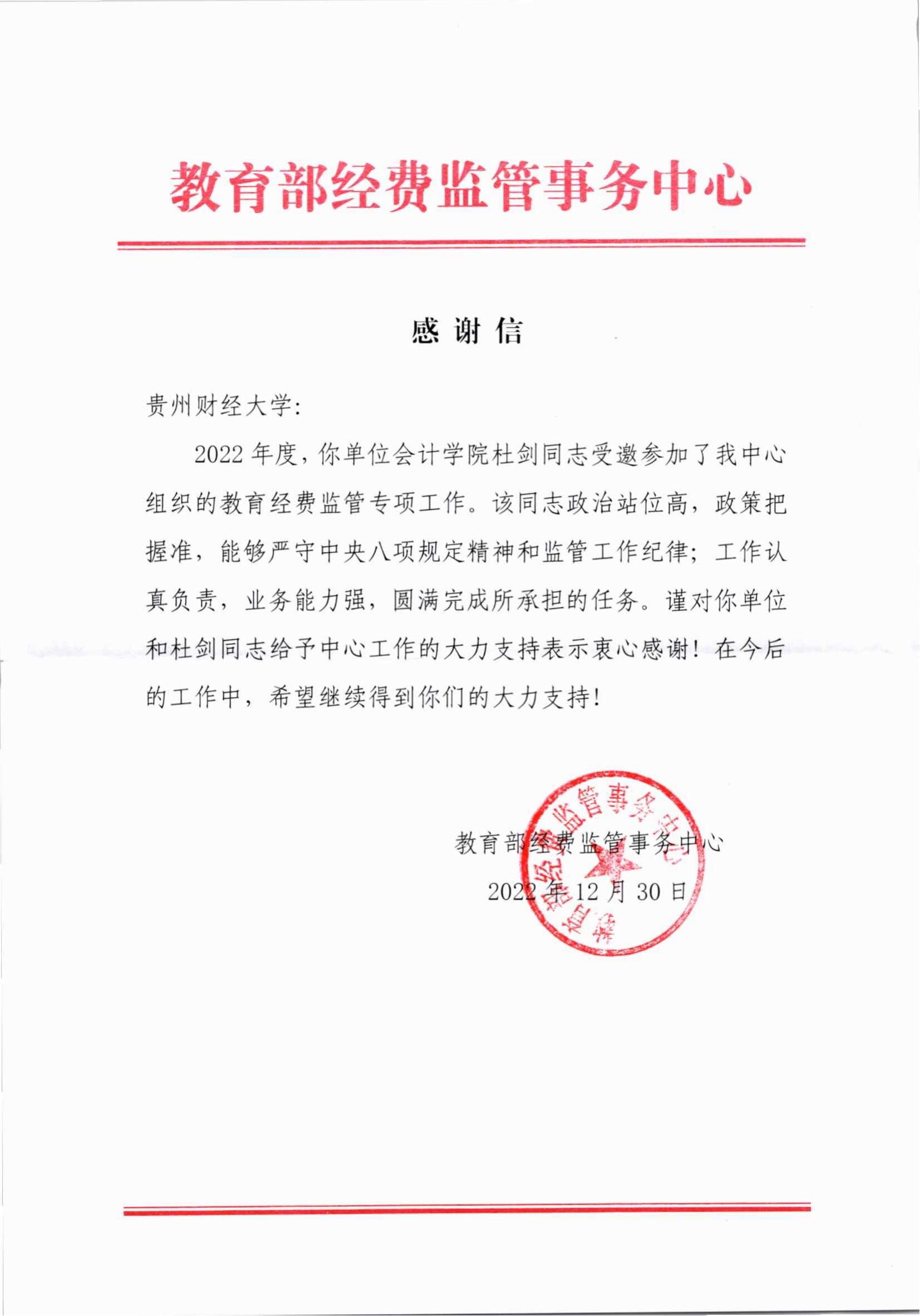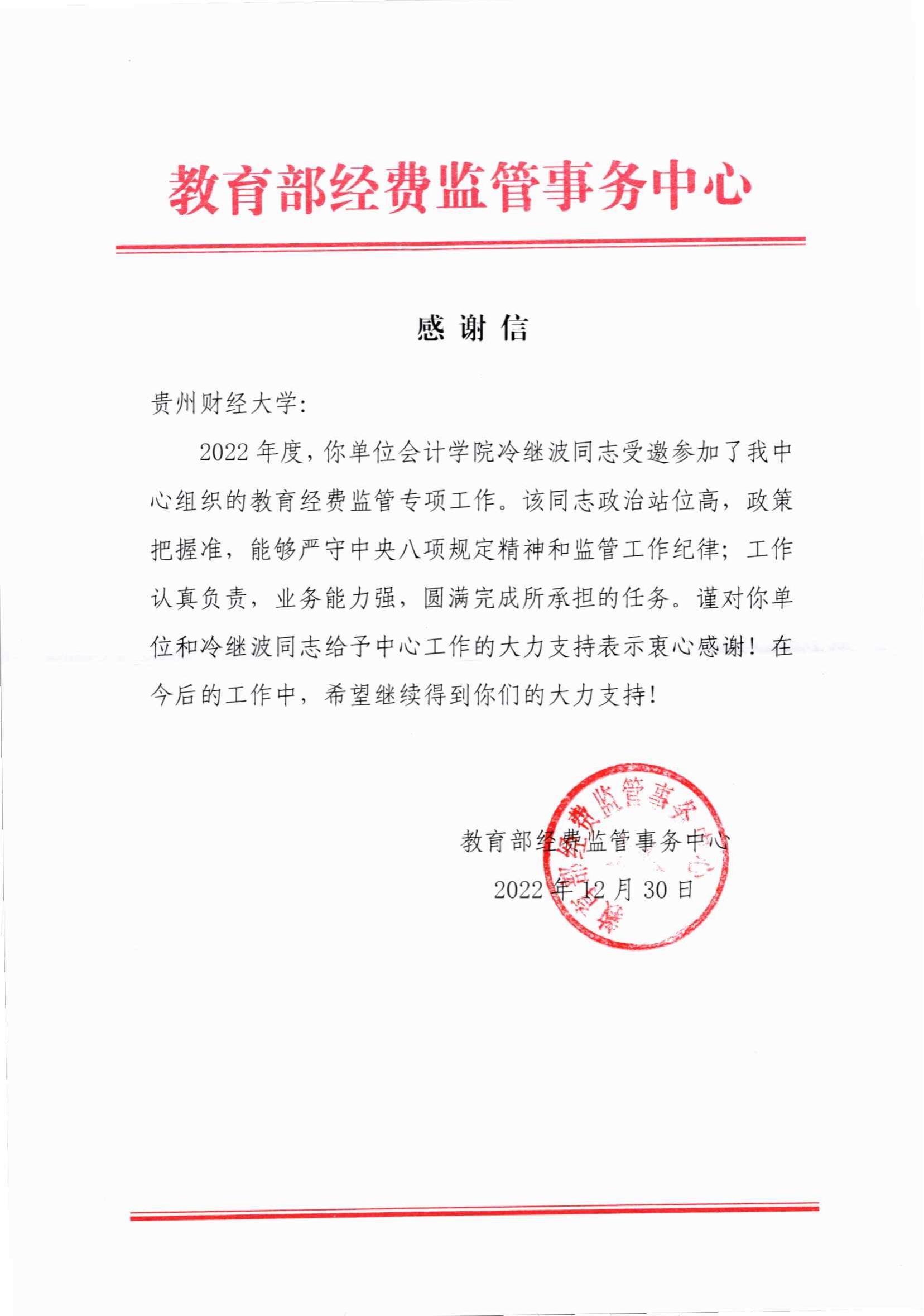 近日,教育部经费监管事务中心向公司bevictor伟德官网发来感谢信,对公司bevictor伟德官网党委书记聂永刚、经理杜剑、教授冷继波2022年参加教育经费监管专项工作表达了衷心感谢,并对三位教授的政治站位、业务能力进行了表扬。