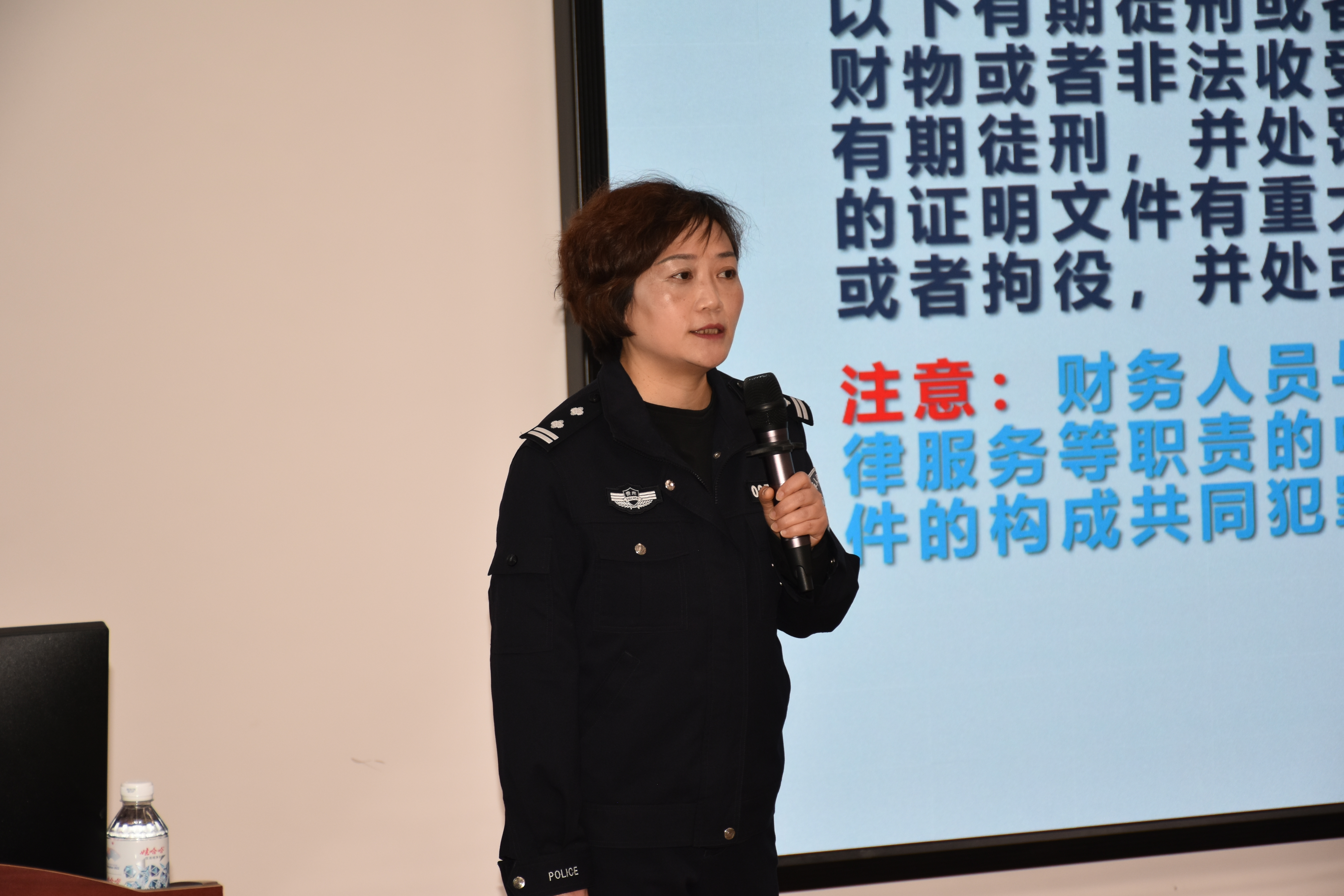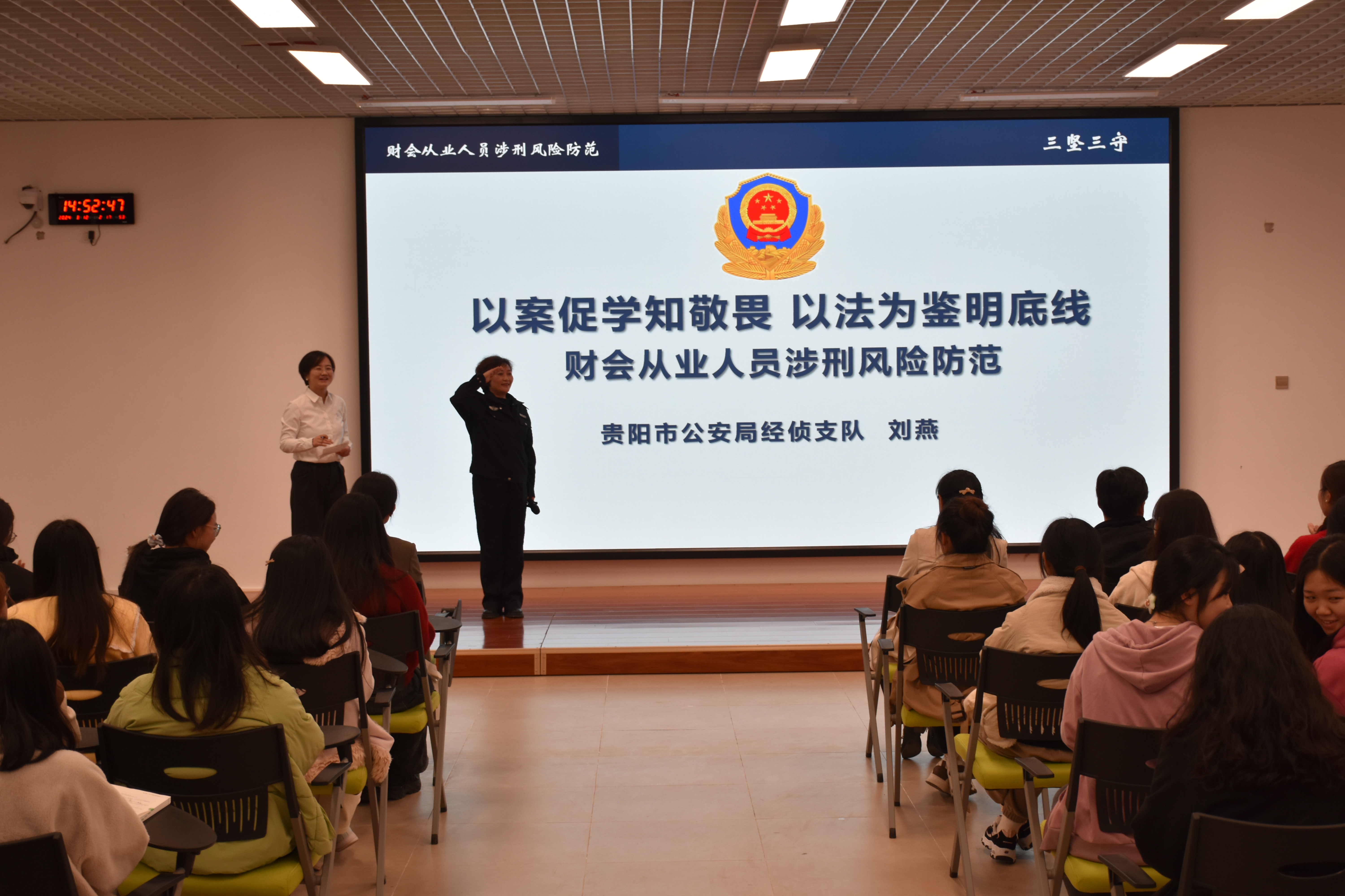 3月12日,为强化员工的法治意识,提升风险识别和防范能力,bevictor伟德官网课程思政教学研究中心、会计职业道德课程组为员工组织了一次别开生面的会计职业道德课堂活动。本次活动邀请了贵阳市公安局公职律师、贵阳市公安局经侦支队四大队副大队长、贵州警察公司经侦专业驻校教官刘燕入校开展警示教育。bevictor伟德官网副经理钱润红、邱静、周松,会计职业道德课程组成员,会计学专业200余名师生参加。教育活动由会计职业道德课程组成员徐筱彧老师主持。