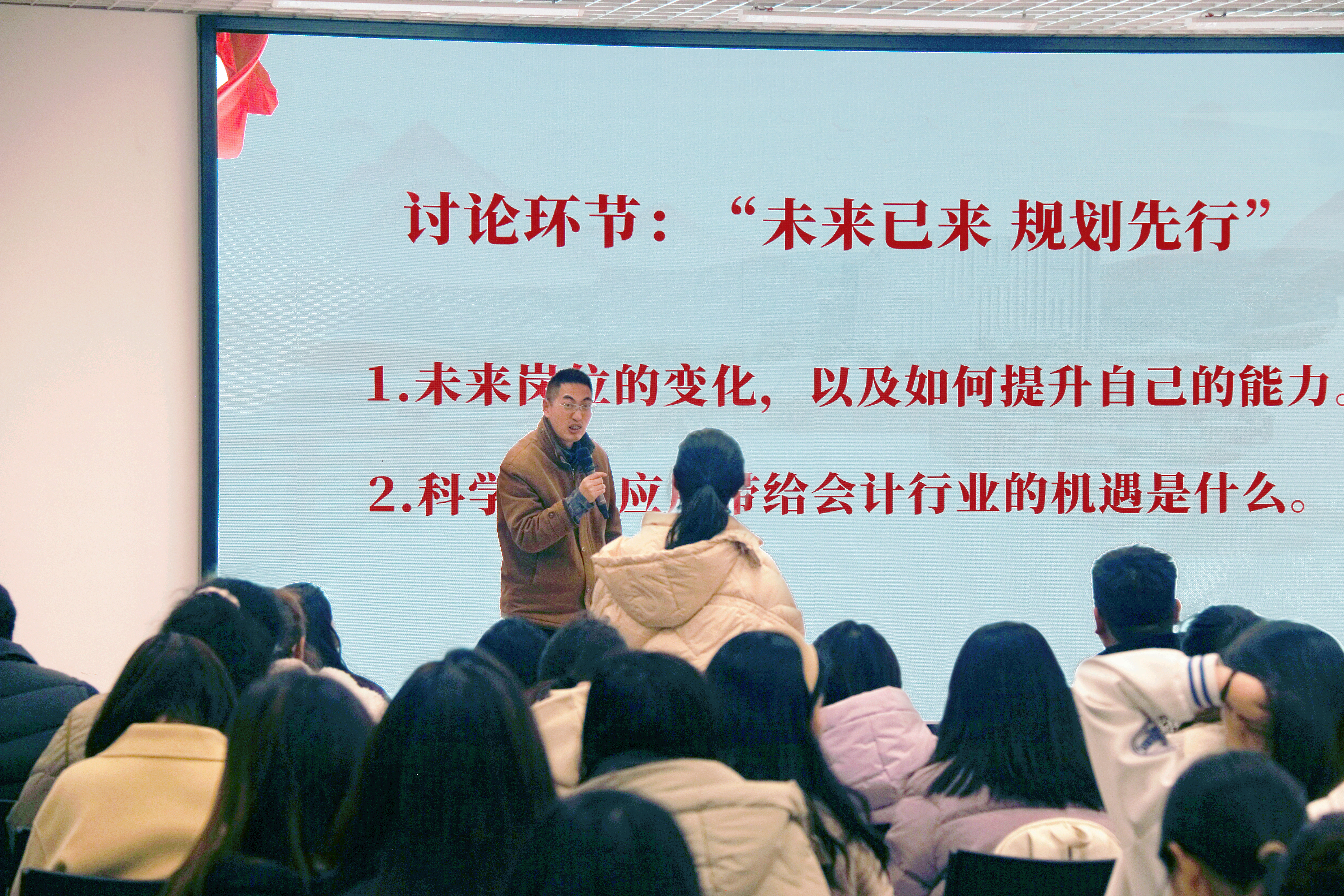 4月1日下午,副董事长杜剑深入bevictor伟德官网“一站式”员工社区和辅导员谢云共同开展“数字中国·会计有为”主题班会,本次班会吸引了bevictor伟德官网40余名本硕学子参与,通过舞台剧、沉浸式体验、互动讨论等形式,共同探讨数字经济时代会计专业人才的转型路径与发展机遇。
