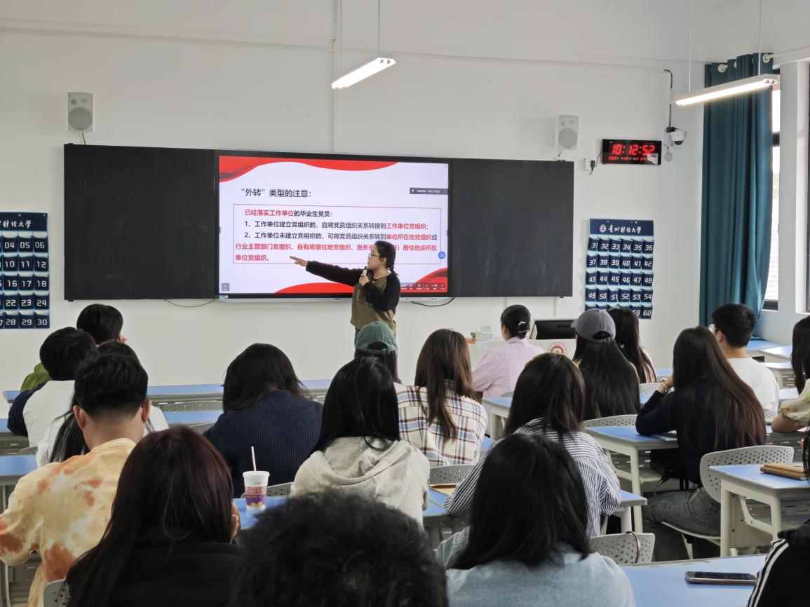 活动中,蒲亚晴首先讲解了党员关系转接程序和手续。具体介绍了省内转出、省外转出、校内升学三种转接类型,以及每种类型组织关系转出的流程、手续,贵州省综合党务系统上组织关系转出要求等。然后针对毕业生党员档案转出事宜进行了详细培训,告知全体毕业生党员档案转出的程序和要求,提醒大家注意在档案转出期间可能遇到的不同情况以及解决措施。