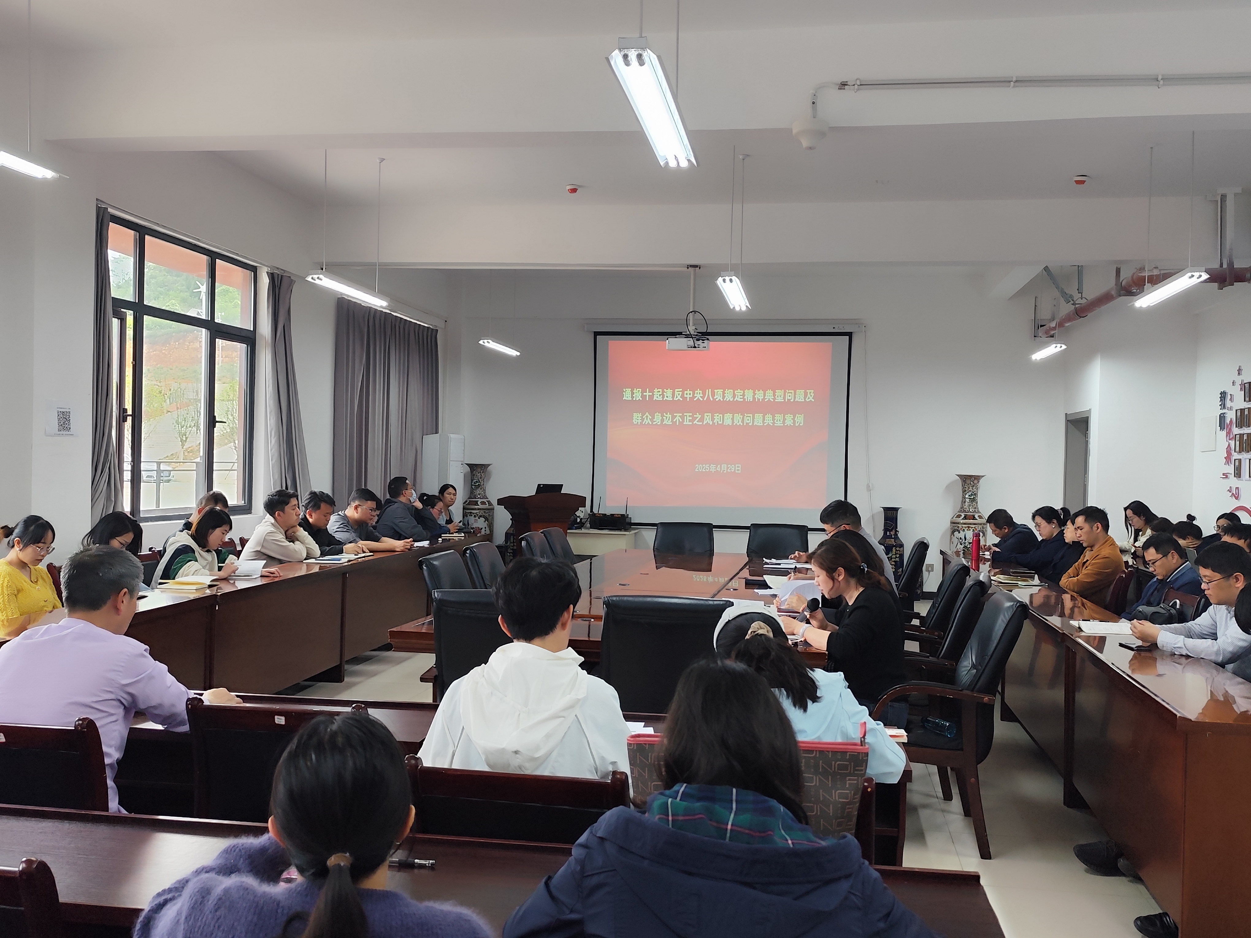 首先,院纪委书记黄忠莉带领大家学习了贵州省纪委省监委派驻韦德官方网站纪检监察组下发《关于认真做好2025年“五一”、端午期间纠“四风”树新风工作的通知》,强调广大教职工要筑牢思想防线,廉洁勤俭过节,持续以优良党风政风引领社风民风,不断涵养风清气正政治生态。其次,她通过剖析违反中央八项规定、群众身边不正之风和腐败问题的典型案例,详细阐述了“规定”精神,持续强化党员干部的纪律意识和规矩意识,切实将中央八项规定精神内化于心、外化于行。