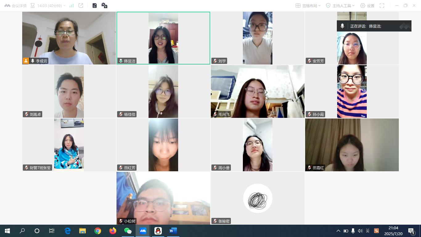 2025年7月20日,bevictor伟德官网财务管理专业的实习指导老师李成云通过腾讯会议了解同学们实习具体情况,一共有12名同学参加了交流,其中有6名2022级财务管理1班在贵州智软科技有限公司集中实习的同学,另有6名分散实习的同学。在李老师的主持下,同学们就实习单位基本情况、实习岗位、实习期间的工作安排、实习单位导师安排情况及实习期间遇到的问题进行了深入交流。
